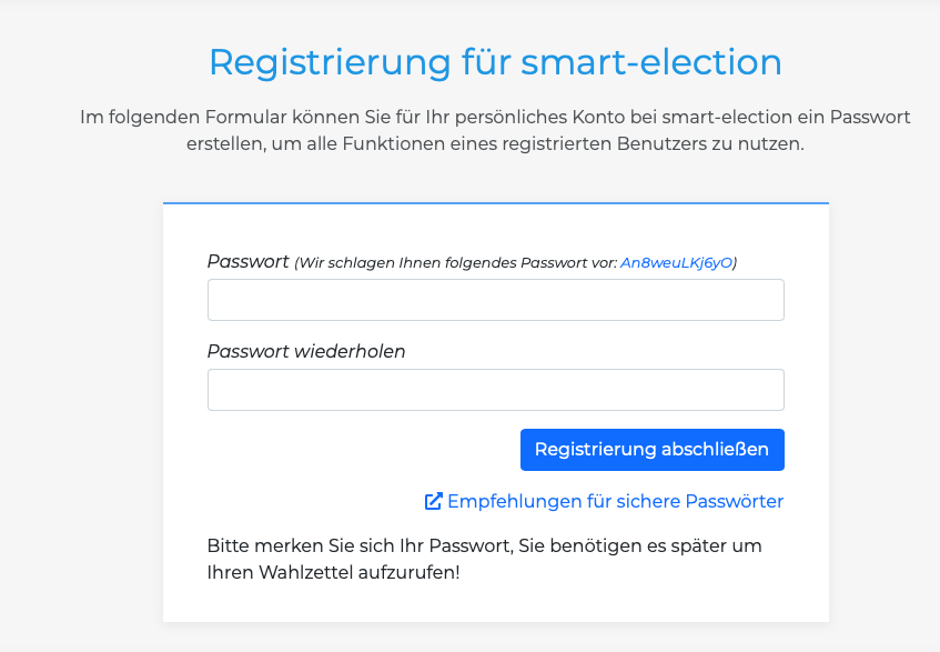 Im Registrierungsformular legen Sie ein persönliches Passwort fest, um später ihren digitalen Wahlzettel aufrufen zu können, sobald die Wahl gestartet wurde.